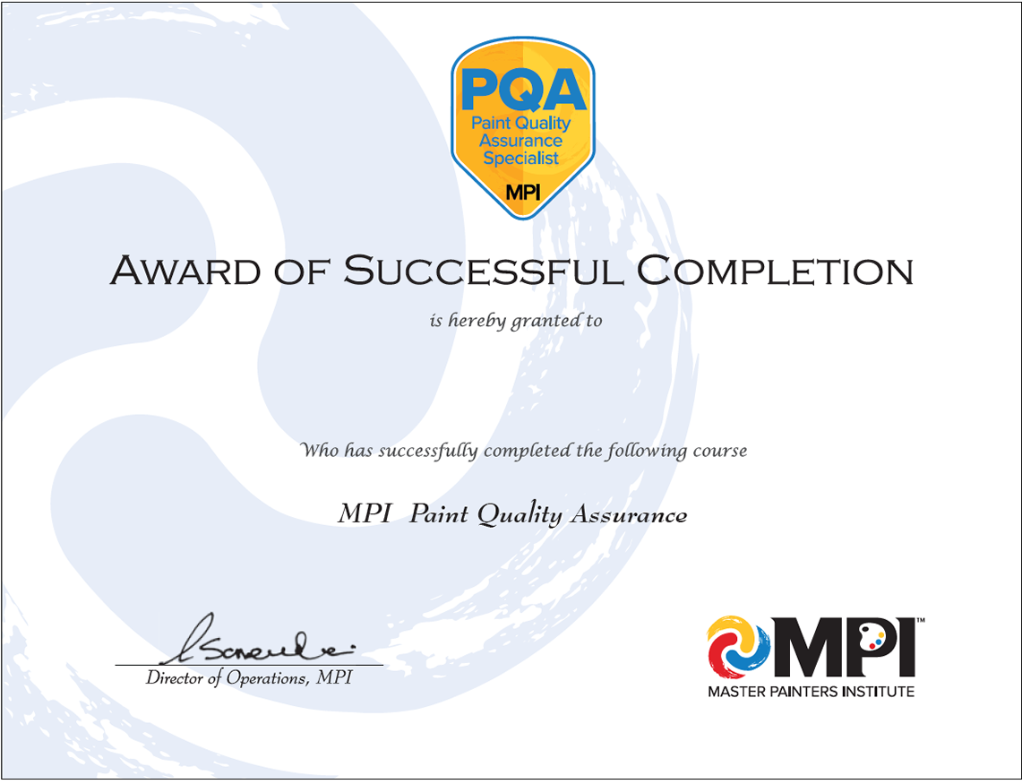 MPI’s Paint Quality Assurance training course is the highest level of commercial/institutional paint training offered and is the final and most comprehensive course in MPI’s training program. Graduates of this course will gain the knowledge required to add value to almost any aspect of an architectural/commercial paint project from specifications, surface preparation, application, paint quality assurance, as well as elements of inspection. Completion of this course is considered a requirement and specified on new build/Architectural and Repainting coatings projects.