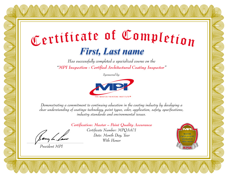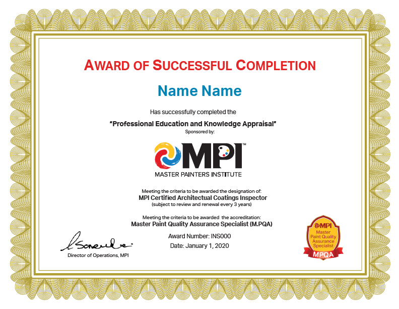 MPI Certified Architectural Coatings Inspector.After Completion of Level 3 – Inspector Level, the student will have the opportunity to apply for the PEKA Assessment, which is required to become an MPI Certified Architectural Coatings Inspector. Level: Advanced Certification term: 5 years Prerequisites: You must pass all of the following courses before you can apply for the PEKA Assessment